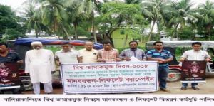 বালিয়াকান্দি  ঃ “ সকল তামাকজাত দ্রব্যের উপর উচ্চহারে করারোপসহ তামাকের সকল নীতির সুরক্ষা নিশ্চিত করা হোক” এ প্রতিপাদ্যকে সামনে রেখে বিশ্ব বৃহস্পতিবার বিশ্ব তামাক মুক্ত দিবস উপলক্ষে র‌্যালী ও লিফলেট বিতরণ করা হয়েছে। রাজবাড়ী জেলা বালিয়াকান্দি উপজেলা রিপোটার্স ক্লাব ও সমন্বিত প্রমিলা মুক্তি প্রচেষ্টার যৌথ উদ্যোগে বাংলাদেশ তামাক বিরোধী জোট ও ওয়ার্ক ফর এ বেটার বাংলাদেশ (ডব্লিউবিবি ট্রাস্ট) সহযোগিতায় বালিয়াকান্দি-পাংশা সড়কের নারুয়া রোডের স্বপ্নদ্বীপ মার্কেটের সামনে মানববন্ধন ও লিফলেট ক্যাম্পেইন কর্মসুচি পালন করে। মানববন্ধন কর্মসূচীতে তামাকের কুফল তুলে ধরে বক্তৃতা করেন, উপজেলা রিপোটার্স ক্লাবের সভাপতি সনজিৎ কুমার দাস, সাধারন সম্পাদক সোহেল রানা, সমন্বিত প্রমিলা মুক্তি প্রচেষ্টার নির্বাহী পরিচালক মোকাররম হোসেন, ব্যবসায়ী বাপ্পী আহম্মেদ, দুলাল হোসেন, নুহ শেখ, আব্দুল খালেক প্রমুখ। মানববন্ধন কর্মসুচিতে বিভিন্ন শ্রেণী-পেশার মানুষ অংশগ্রহন করেন। পরে লিফলেট বিতরণ করা হয়।