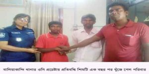 বালিয়াকান্দি   ঃ খালি গায়ে ঘুরতে দেখে থানায় নিয়ে আসে স্থানীয় লোকজন। শুরু করেন তার পরিবারের সন্ধান পাওয়ার নানা কৌশল। খালি-গায়ে না রেখে তার গায়ে তুলে দেন নতুন গেঞ্জি। শিশুটিকে পরিবারের হাতে তুলে দিতে ব্যাকুল হয়ে পড়েন রাজবাড়ী জেলার বালিয়াকান্দি থানার অফিসার ইনচার্জ হাসিনা বেগম। অবশেষে তার প্রচেষ্টায় ওই শিশুটি বুধবার এক বছর পর ফিরে পেল তার পরিবারকে। ওই শিশুটির নাম, শাওন (১৭)। তার পিতার নাম, গণি। বাড়ী চুয়াডাঙ্গা সদর থানার বোয়ালমারী গ্রামে।