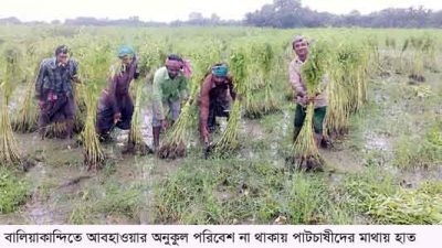 বালিয়াকান্দি ঃ আবহাওয়ার অনুকুল পরিবেশ না থাকার কারণে পাট উৎপাদনে বিখ্যাত এলাকা হিসেবে পরিচিত রাজবাড়ীর বালিয়াকান্দি উপজেলার পাটচাষীদের মাথায় হাত পড়েছে। অতিবৃষ্টির কারণে মাঠে পাটের জমিতে পানি জমে যাওয়ার ফলে পাটের শিকর গজিয়ে কাটতে বাধ্য হচ্ছে। এতে ফলন বিপর্যয় ঘটছে।
