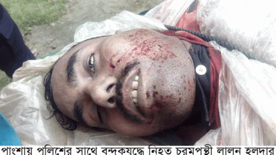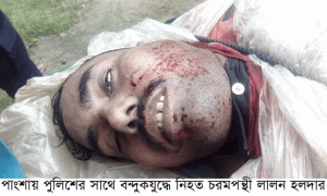 পাংশা ॥ রাজবাড়ীর পাংশায় পুলিশের সাথে বন্দুকযুদ্ধে সর্বহারা লাল পতাকা জুলহাস বাহিনীর সেকেন্ড-ইন-কমান্ড লালন হলদার (৪২) নামের এক চরমপন্থী নিহত হয়েছে। নিহত লালন পাবনা জেলার সুজানগর উপজেলার গোবিন্দপুর গ্রামের জিতেন হলদারের ছেলে। জানা গেছে লালন একজন পেশাদার কিলার, টাকার বিনিময়ে সে মানুষ হত্যা করত। বাহাদুরপুর তদন্ত কেন্দ্রের ইনচার্জ সৈয়দ সাজেদুর রহমান জানায়, গোপন সংবাদের ভিত্তিতে ২৬ জুলাই বিকাল সাড়ে ৩টার সময় লালনকে হাবাসপুর বেড়িবাঁধ এলাকা থেকে গ্রেফতার করা হয়। লালনের স্বীকারোক্তি মোতাবেক ২৭ জুলাই শুক্রবার রাত আনুমানিক ২টার দিকে হাবাসপুর ইউনিয়নের চরআফড়া গ্রামের কাটাজোলা খালের পশ্চিম পার্শ্বে অভিযান চালালে সেখানে পূর্ব থেকে ওৎ পেতে থাকা আসামীর সহযোগিরা পুলিশকে লক্ষ্য করে গুলি ছুঁড়ে। পুলিশ পাল্টা গুলি চালালে লালনের সহযোগিরা পালিয়ে যায়। এসময় পুলিশের ছোঁড়া গুলিতে লালন গুলিবিদ্ধ হয়। গুলিবিদ্ধ অবস্থায় লালনকে পাংশা উপজেলা স্বাস্থ্য কমপ্লেক্সে নিয়ে আসলে কর্তব্যরত চিকিৎসক তাকে মৃত বলে ঘোষণা করে। এসময় ঘটনাস্থল থেকে একটি একনলা বন্দুক, একটি ওয়ান শুটারগান, চারটি গুলির খোসা ও দুইটি তাজা কার্তুজ উদ্ধার করেছে পুলিশ। অভিযানে কনস্টেবল সাধন ও কনস্টেবল জালাল আহত হয়। লালনের বিরুদ্ধে রাজবাড়ী ও ফরিদপুরে ৪ টি মামলা ছিল। এর মধ্যে ২টি মামলায় সে সাজাপ্রাপ্ত ছিল। শুক্রবার সকালে নিহত লালন হলদারের লাশ রাজবাড়ীর মর্গে প্রেরণ করা হয়েছে।