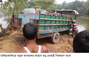 বালিয়াকান্দিতে সড়ক খনাখন্দের কারণে খড় বোঝাই পিকআপ খালে