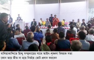 বালিয়াকান্দি (রাজবাড়ী) ঃ কোন রকম ভয় ভীতিতে ভীত না হয়ে আসন্ন জাতীয় সংসদ নির্বাচনে নির্ভয়ে ভোট প্রদান করবেন। বাংলাদেশ সম্প্রীতির দেশ। সে হিসেবে বালিয়াকান্দি শান্তপ্রিয় এলাকা। এখানে কোন রকম সন্ত্রাসী কর্মকান্ডের সুযোগ নেই। জেলা পুলিশ আপনাদের সাথে থাকবে। শুক্রবার বিকালে রাজবাড়ীর বালিয়াকান্দি উপজেলার জামালপুর বাজার কালী মন্দির প্রাঙ্গনে থানা পুলিশের আয়োজনে হিন্দু সম্প্রদায়ের লোকদের নিয়ে আইন-শৃঙ্খলা বিষয়ক মতবিনিময় সভায় প্রধান অতিথির বক্তৃতায় রাজবাড়ী পুলিশ সুপার আসমা সিদ্দিকা মিলি এসব কথা বলেন।
