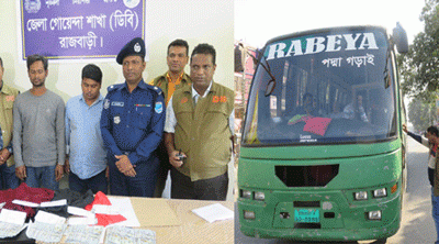 গ্রেপ্তারকৃতরা হলেন, টাঙ্গাইল জেলার নাগরপুর এলাকার আবু সাইদ মিয়ার ছেলে মোঃ পারভেজ মিয়া ও মানিকগঞ্জ জেলার সাটুরিয়া এলাকার কাদের আলীর ছেলে শওকত আলী। শুক্রবার দিবাগত রাতে অভিযান চালিয়ে তাদের গ্রেপ্তার করা হয়। রাবেয়া (পদ্মা গড়াই) বাস নং- রেজিঃ নং রাজবাড়ী-ব-১১-০০৪৪